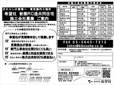 東京の物件について“JCM(日本型コンストラクションマネジメント)方式”で総合建設会社、専門工事会社の募集を行っています。